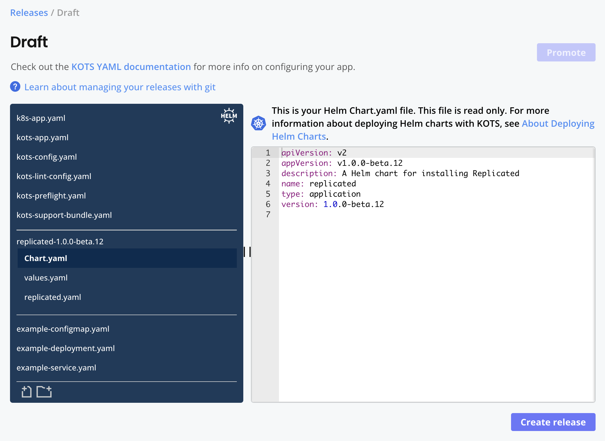 5. (Optional) Add a KOTS HelmChart custom resource to the release to support installation with Embedded Cluster, KOTS, or kURL. For more information, see Configure the HelmChart Custom Resource v2.